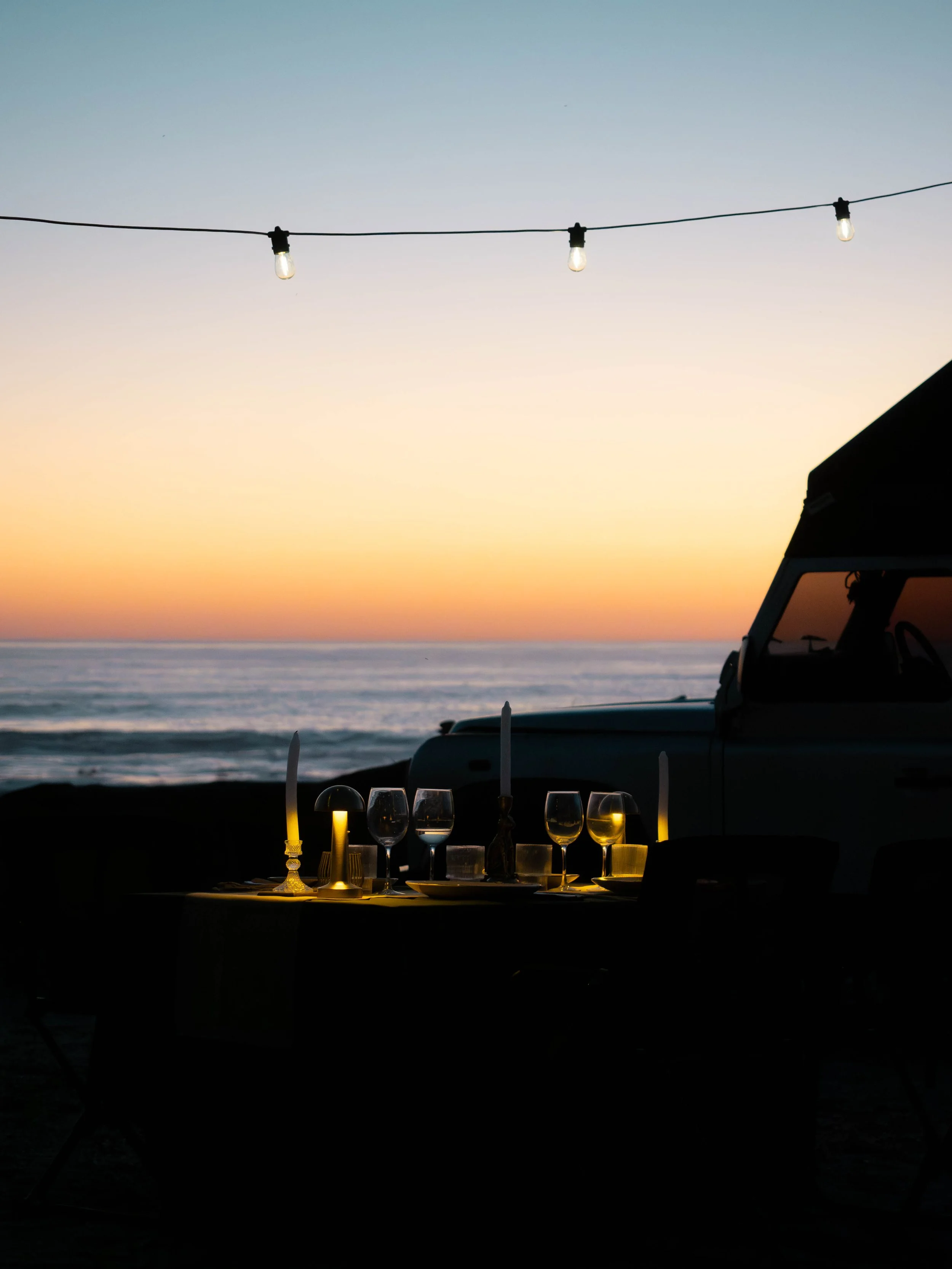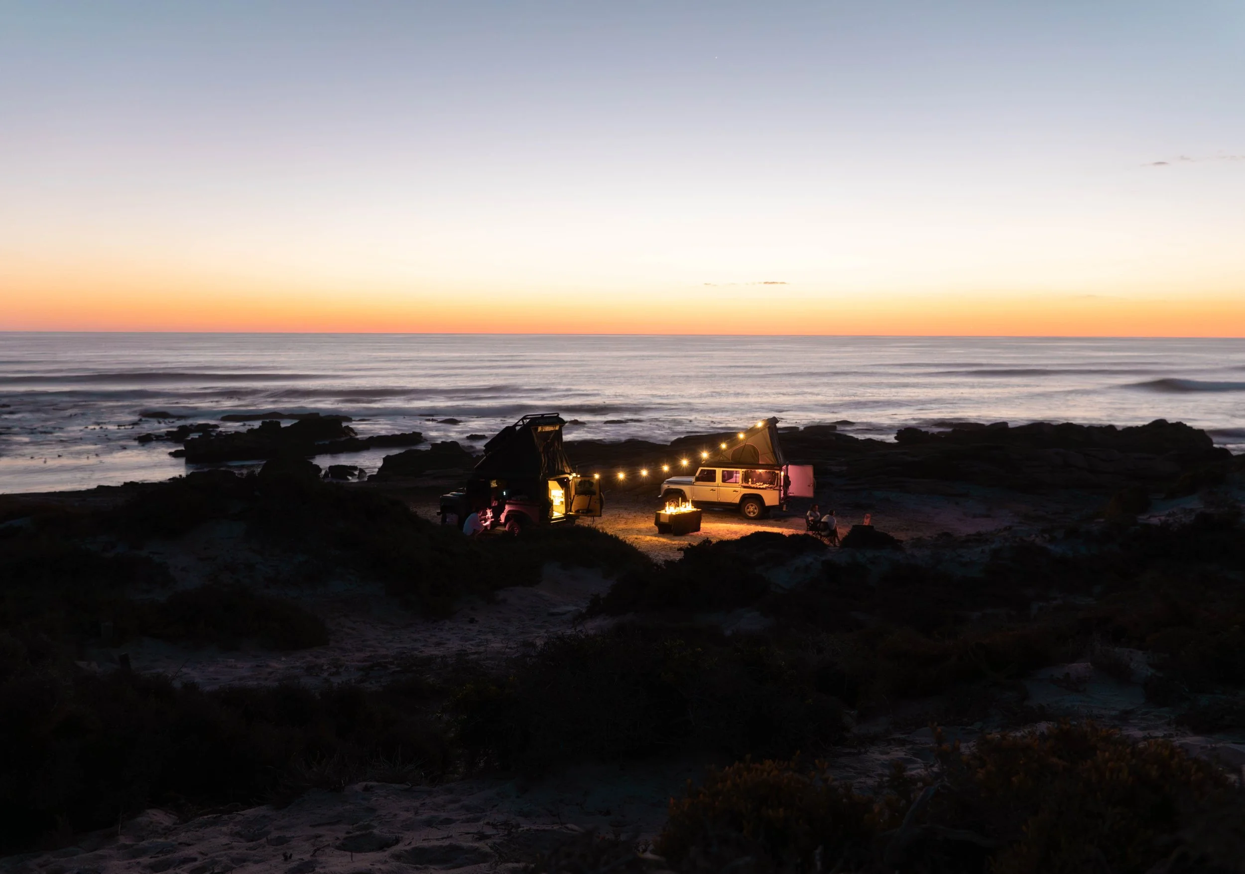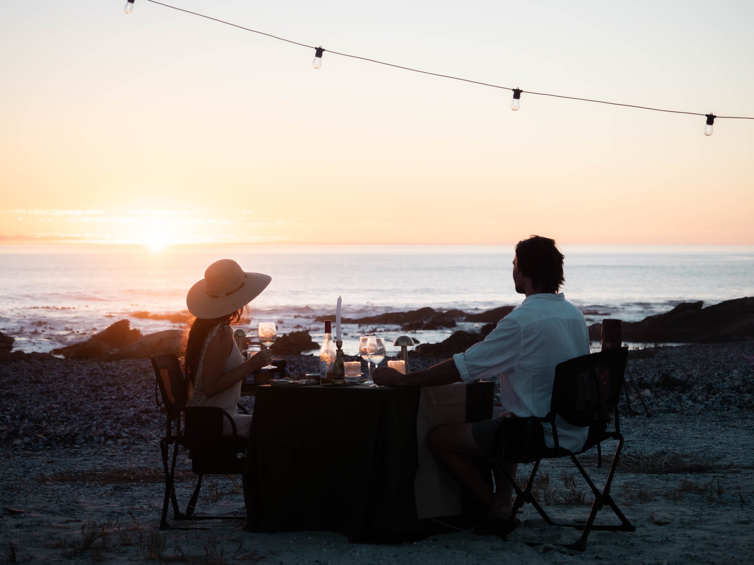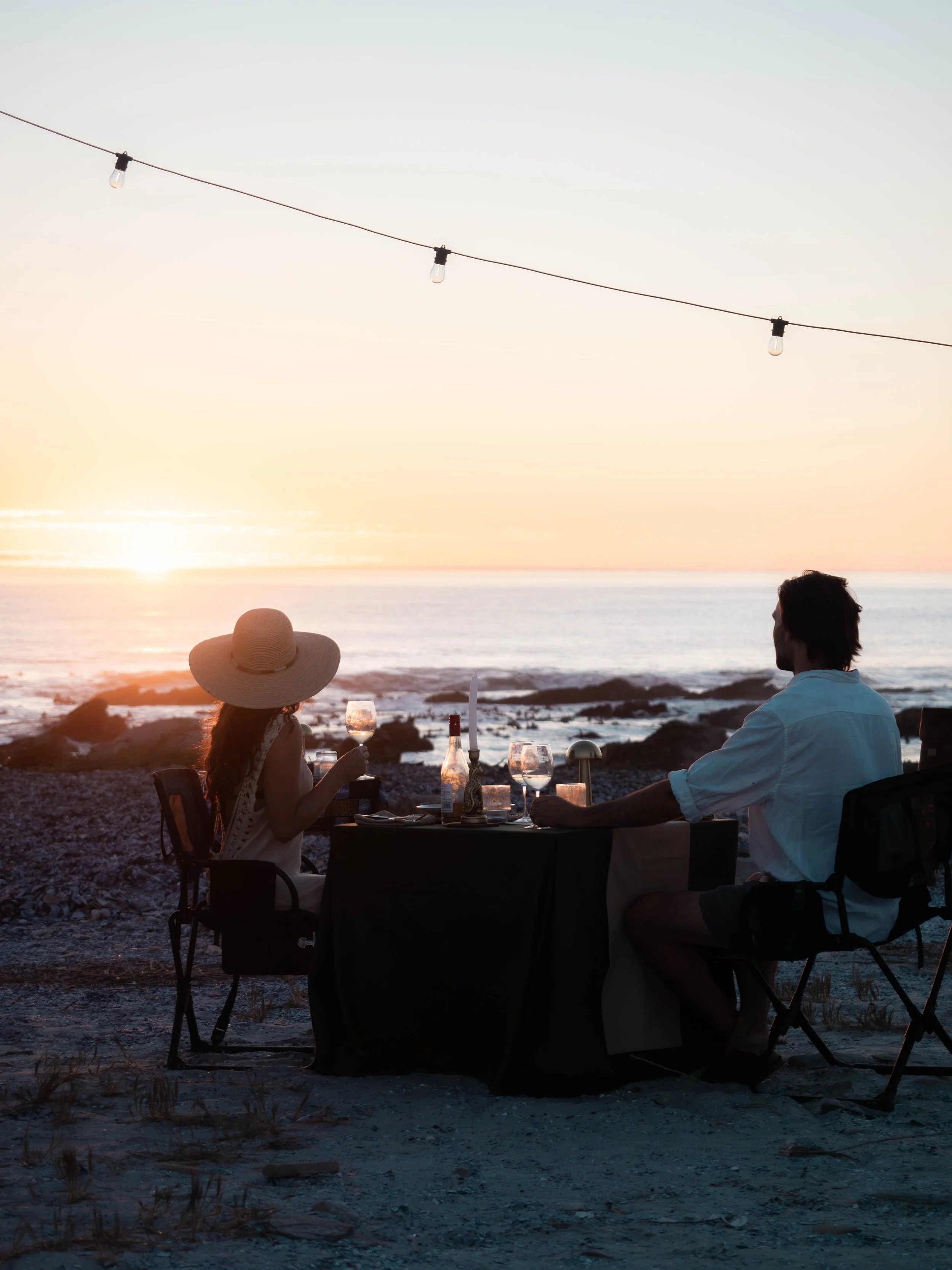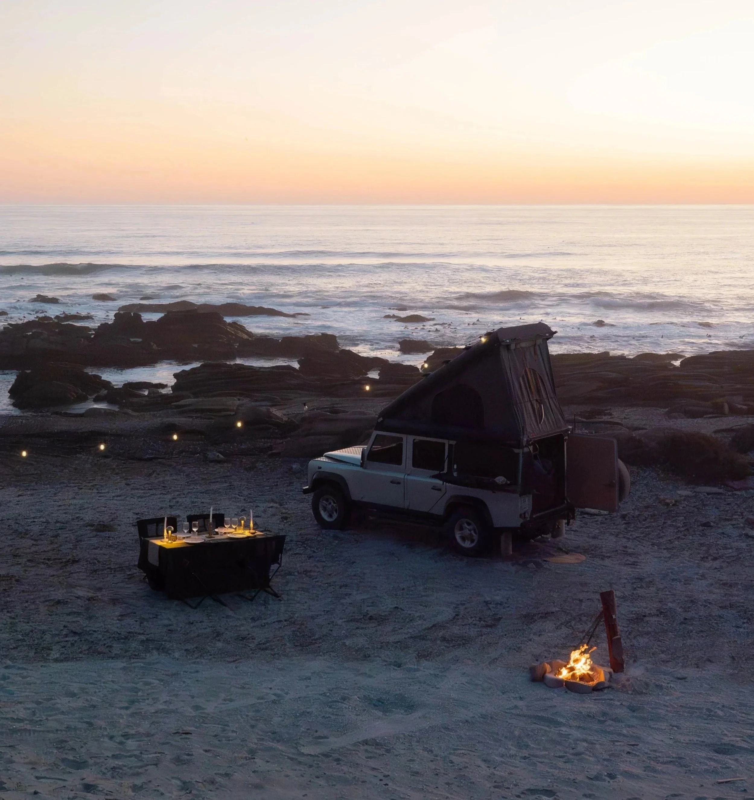 Dès lors que le camp prend place, le feu s’allume. Un sundowner est servi face au paysage, puis le dîner est dressé dans la lueur des flammes. La soirée se prolonge sous les étoiles, dans un silence rare.